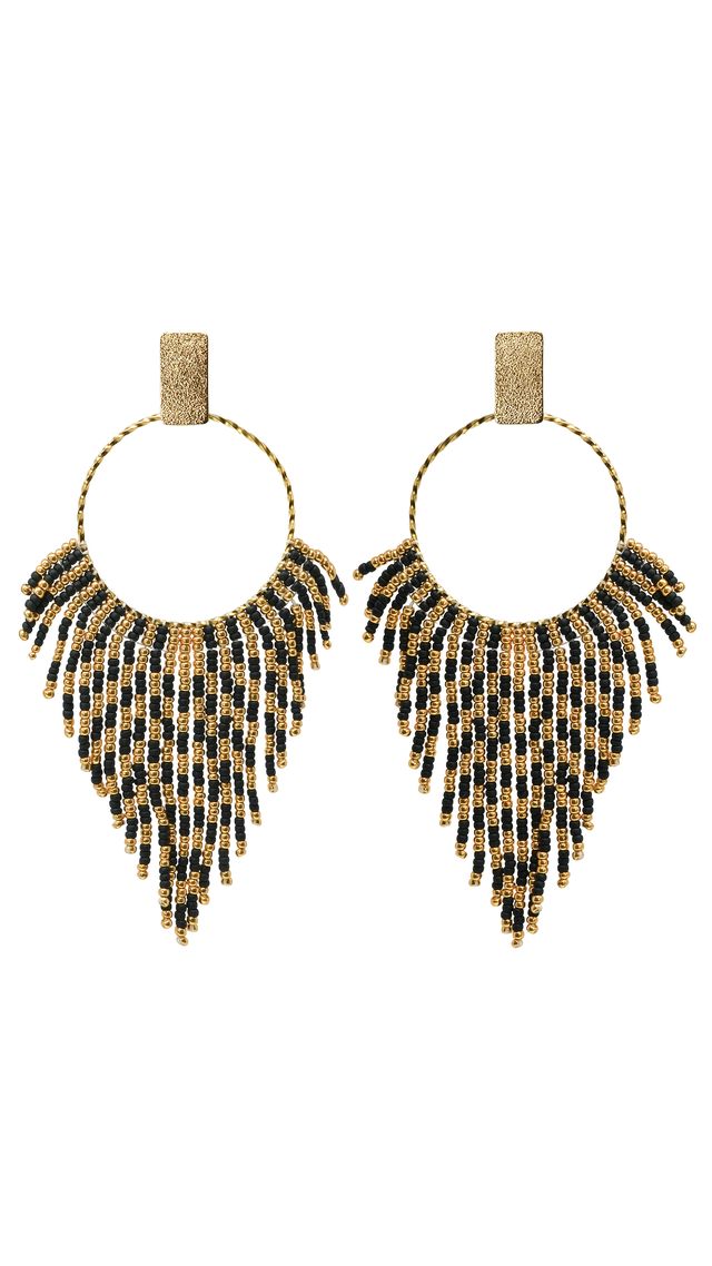 These earrings feature a bold circular frame, plated in 18K gold, and adorned with delicate glass beads in black, white, and metallic tones—adding a refined shimmer to your look. Perfect for elevating any outfit, from a casual day ensemble to an evening celebration.
